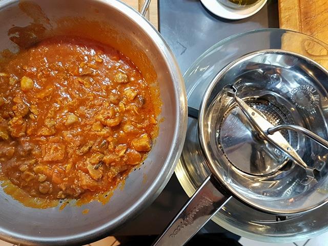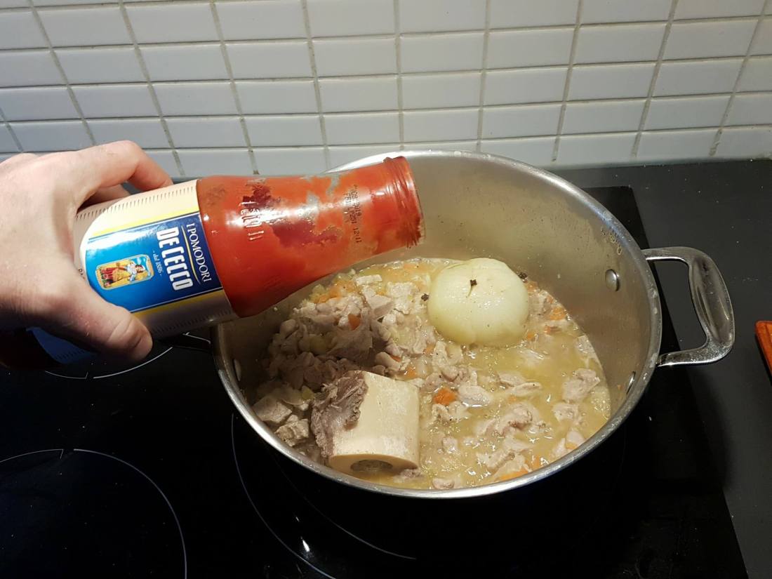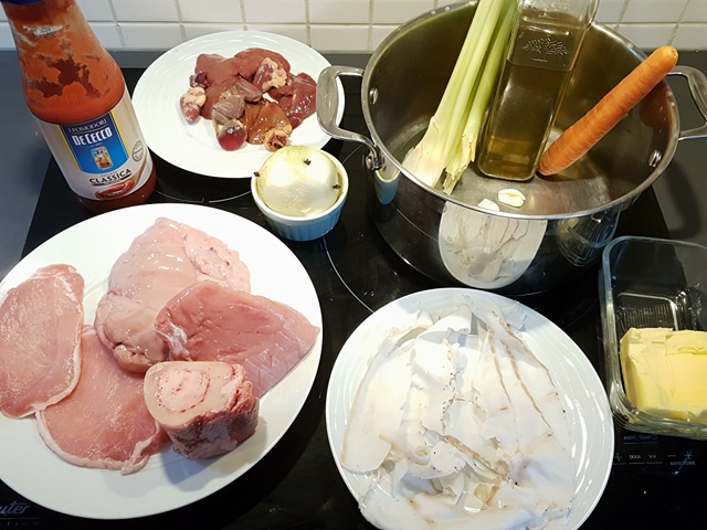 Le lendemain, jour J, préparation des ingrédients : du lard de porc (A.O.C. de Montefeltro), une carotte et une branche de céleri, une gousse d’ail, un oignon entier avec dedans trois clous de girofle, du beurre, un os de boeuf pour le bouillon, du magro di vitello (quasi de veau) et magro di maiale (une côte première sans os de porc), des ris de veau, des abats de poulet, de la sauce tomate et de l’huile extra vierge d’olive.