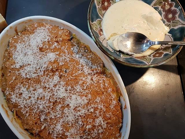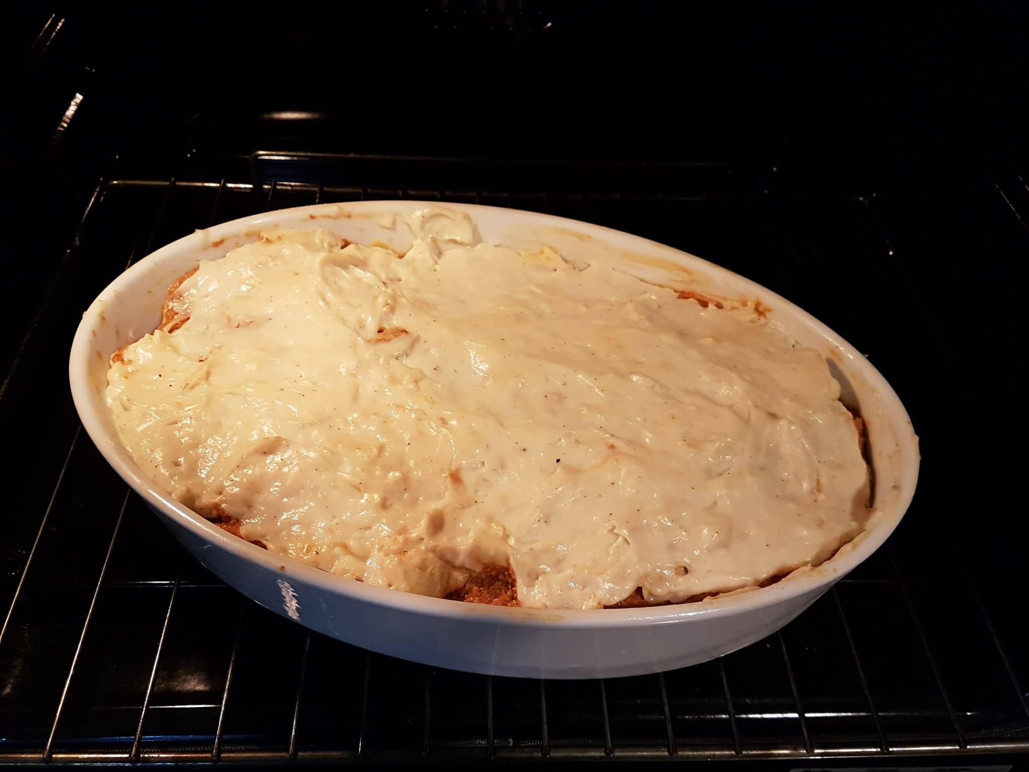 Sur la dernière couche, on verse la béchamel, pour sceller ce concentrée de calories !