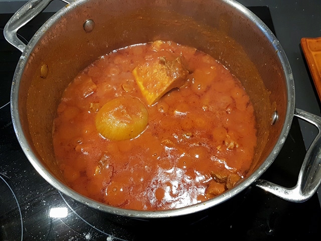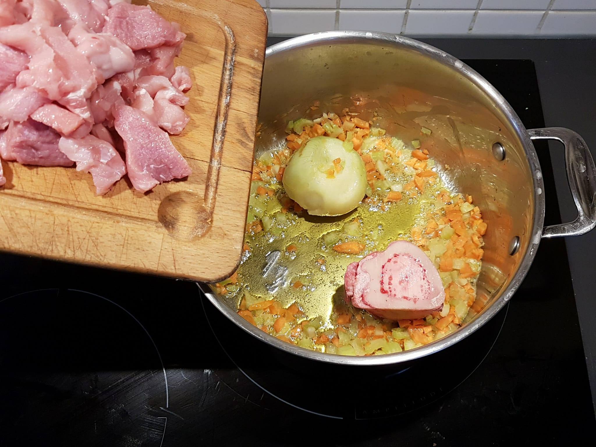 Etape 3 : quand le tout a doré, j’ai inclus l’os et la viande en morceaux.