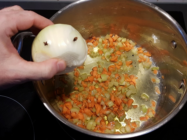 Etape 2 : j’ai émincé céleri, carotte et ail, et je les ai mis à frire dans une casserole avec une noix de beurre et un peu d’huile. Le moment venu, j’ai ajouté l’oignon…