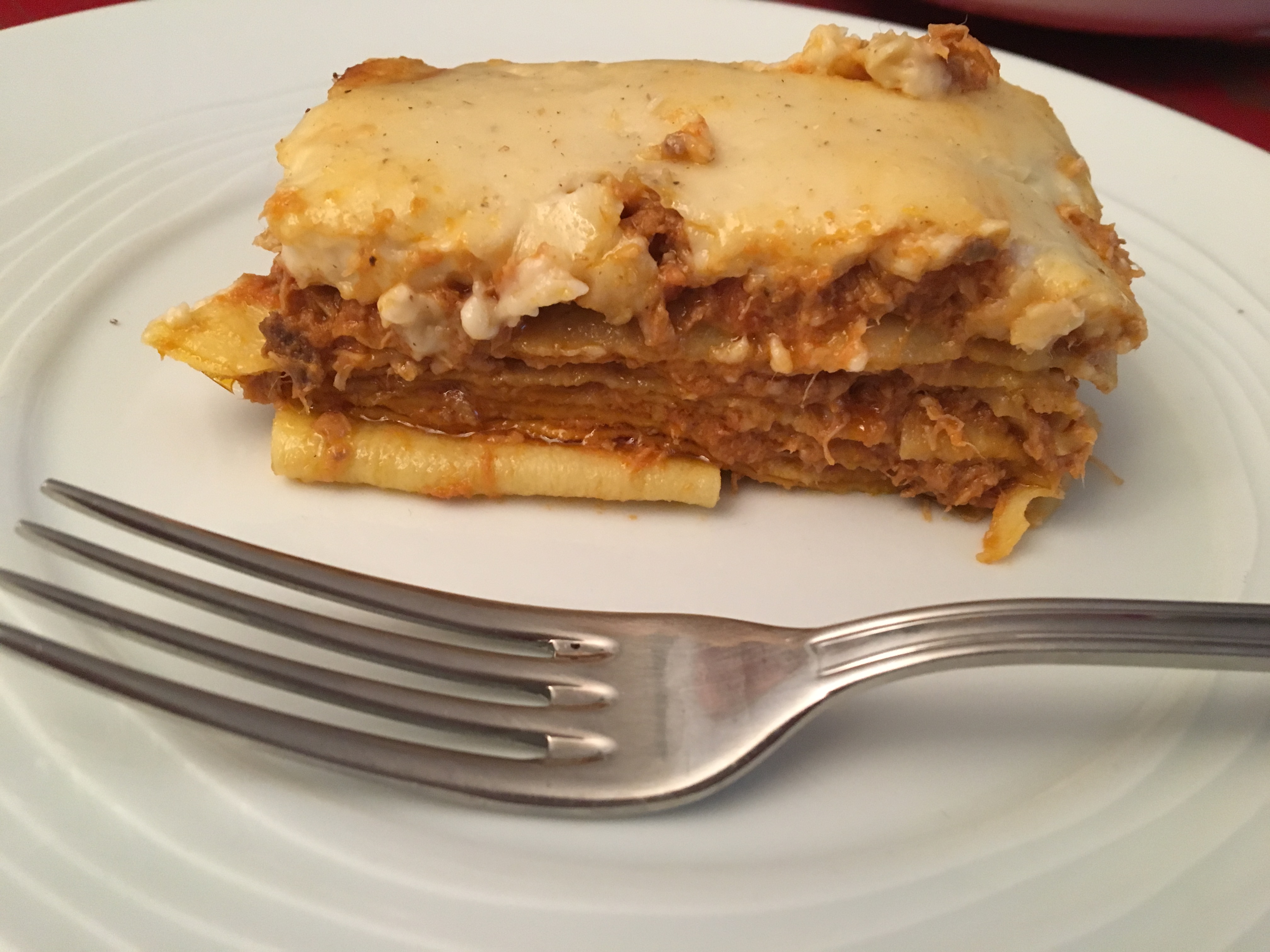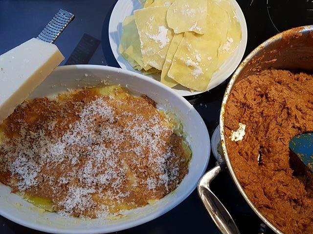 Etape 7 : l’entrée en jeu des lasagnes faites maison. Dans un plat à four, il faut commencer par beurrer le fond du plat. Ensuite, une couche des pâtes, une goutte d’huile pour mieux étaler le ragù, et puis du parmesan râpé. La tradition veut qu’il y ait au total 10 couches de pâtes. Je crois que j’ai réussi à en faire huit. Pas mal, pour une première, et puis, c’était un dimanche…