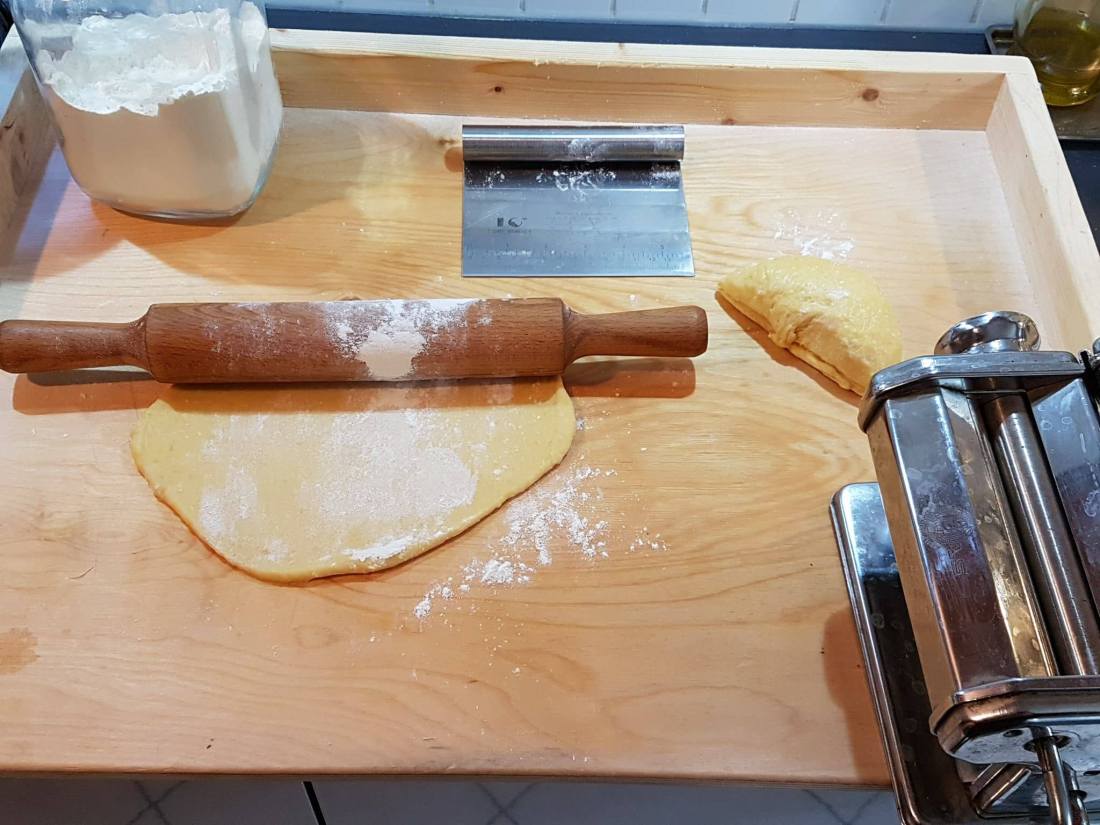 …avant de l’étaler sur une planche en bois, d’abord à l’aide d’un rouleau à pâtisserie, et ensuite avec la vieille machine à pâte de ma mère (et la faire marcher tout seul ça n’a pas été une partie de plaisir)…