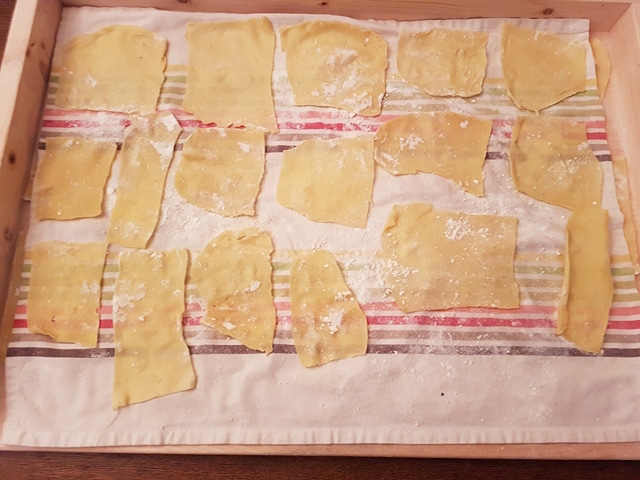 Le but visé était de créer des carrés/rectangles à peu près réguliers, d’environs 10×15 cm., pour mieux les placer dans le plat à four. Mais avant d’y arriver, j’ai du le faire reposer encore une demi journée, et puis les ébouillanter quelques secondes dans une casserole, et de les passer un instant dans un autre récipient plein d’eau froide et salée. Le tout pour obtenir des pâtes fraîches, mais « dures ». Ce travail terminé, je les ai laissées toute la nuit sous un torchon propre. Faites comme moi, et vous comprendrez pourquoi les chefs (et les femmes) d’autrefois se levaient de si bonne heure…