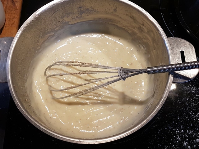 Etape 5 : la béchamel, comme au temps de la noblesse (même si je ne suis pas de La Varenne). D’ailleurs c’est simple : il suffit de fouetter de la farine tamisée dans du beurre pour créer le roux, et puis d’ajouter du lait, du poivre et de la noix de muscade. En cela, la plaque à induction a son importance capitale…