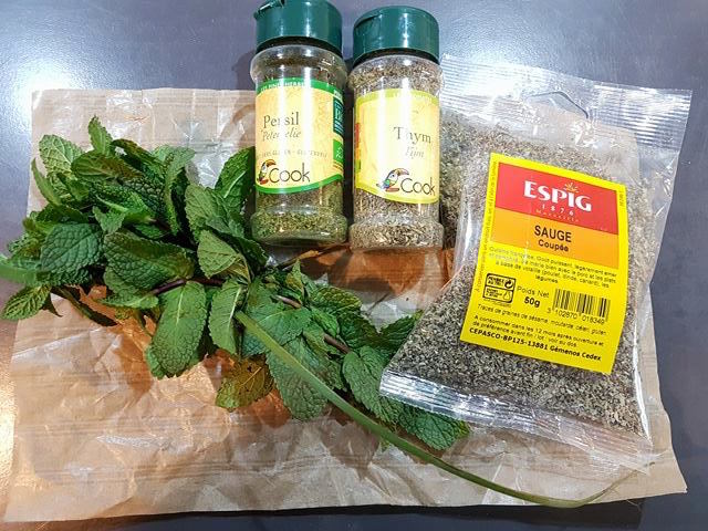Il faut aussi mettre de côté les aromates: moi j’avais sous la main de la menthe fraîche, de la sauge, du persil, du thym…