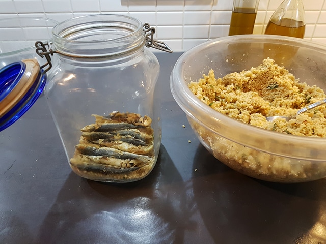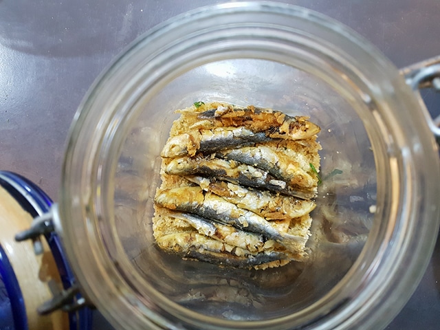 Le reste est simple. Dans un bocal en verre, on dépose une couche de chapelure, et une couche de poissons.