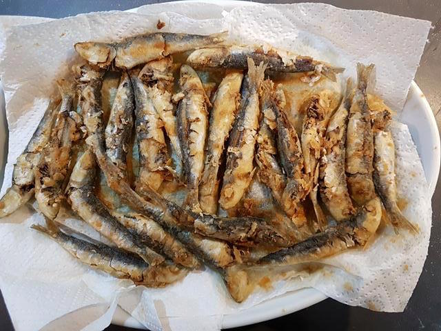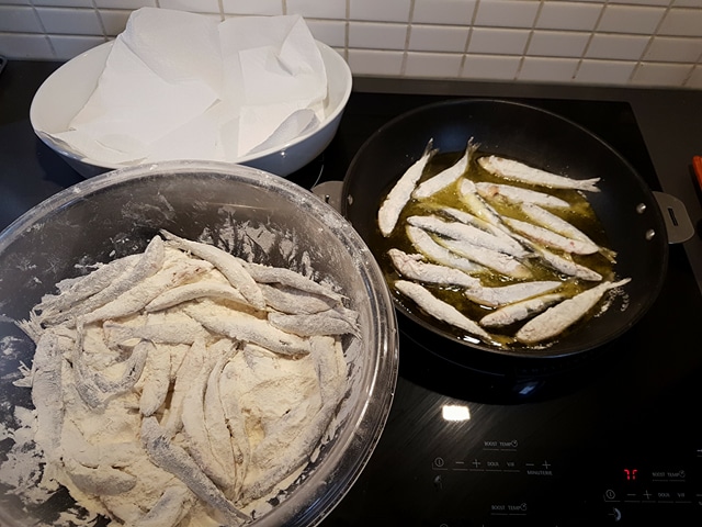 Mais avant toute autre choses, il faut tamiser de la farine T45. Avec elle, on panera les poissons (entiers, tête et arrête comprises). Après quoi, on pourra les frire dans de l’huile extra vierge d’olive.