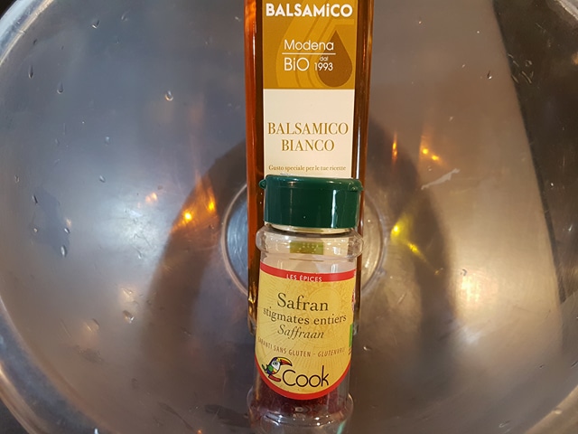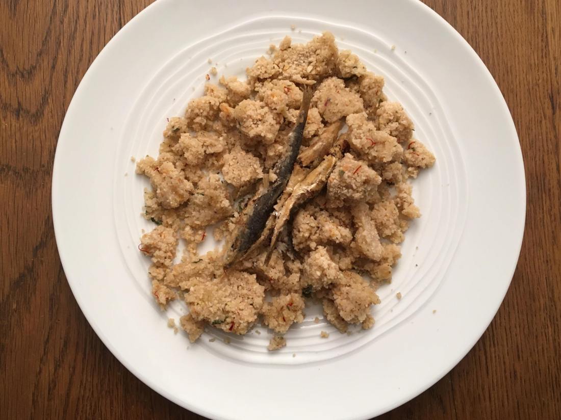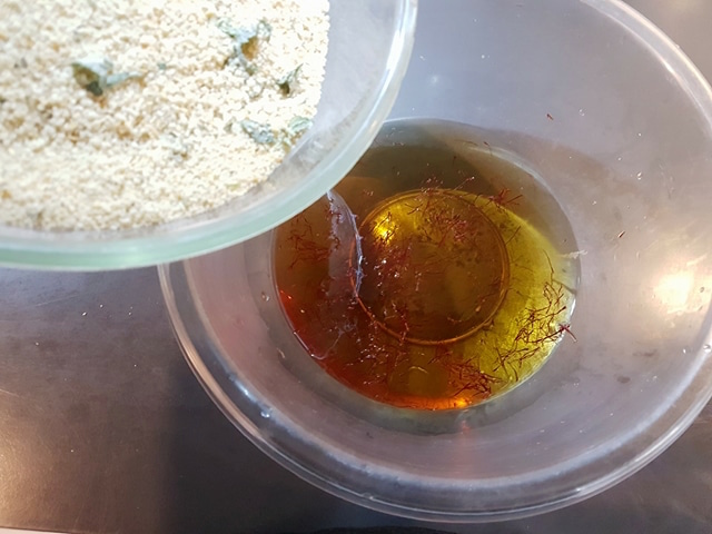 800 g. de poisson gras ou similaires, trois sachets de safran, 800 cl de vinaigre de vin blanc (même balsamique), 600 g. de mie de pain à râper (ou de chapelure), 50 g. d’aromates (menthe, sauge, thym, persil, romarin, ecc.), farine T45 pour paner, huile extra vierge pour frire, sel, poivre