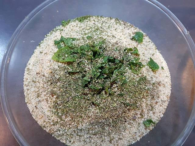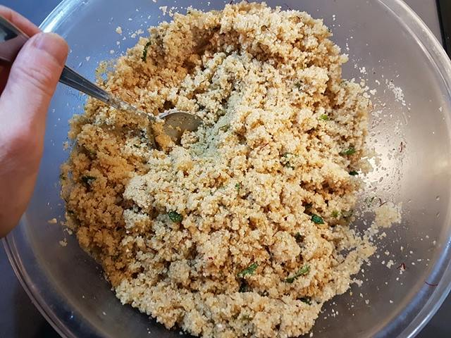 Ensuite, j’ai mélangé la chapelure de pain avec les aromates. A Gallipoli, on utilise un instrument (crattacasa) similaire à une grosse râpe à fromage, sur lequel on frotte la mie d’une miche de pain jusqu’à remplir un seau en bois.