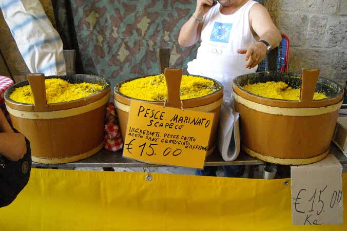 Par exemple l’empereur romain germanique Frédéric II Hohenstaufen, teuton de sang mais italien de naissance et culture, avait l’habitude de commander à son chef cuisinier de lui préparer les meilleurs poissons du lac (saumâtre) de Lesina dans les Pouilles pour réaliser une « aschipescia » à base d’anchois, d’aubergines, d’huile d’olives, de menthe, de vinaigre, de sel et de poivre. Donc aux alentours de 1240, c’est à dire bien 200 ans avant l’arrivée des Espagnols (ou Catalans, comme vous préférez) dans le Sud de l’Italie, le scapece de Gallipoli était déjà une réalité !