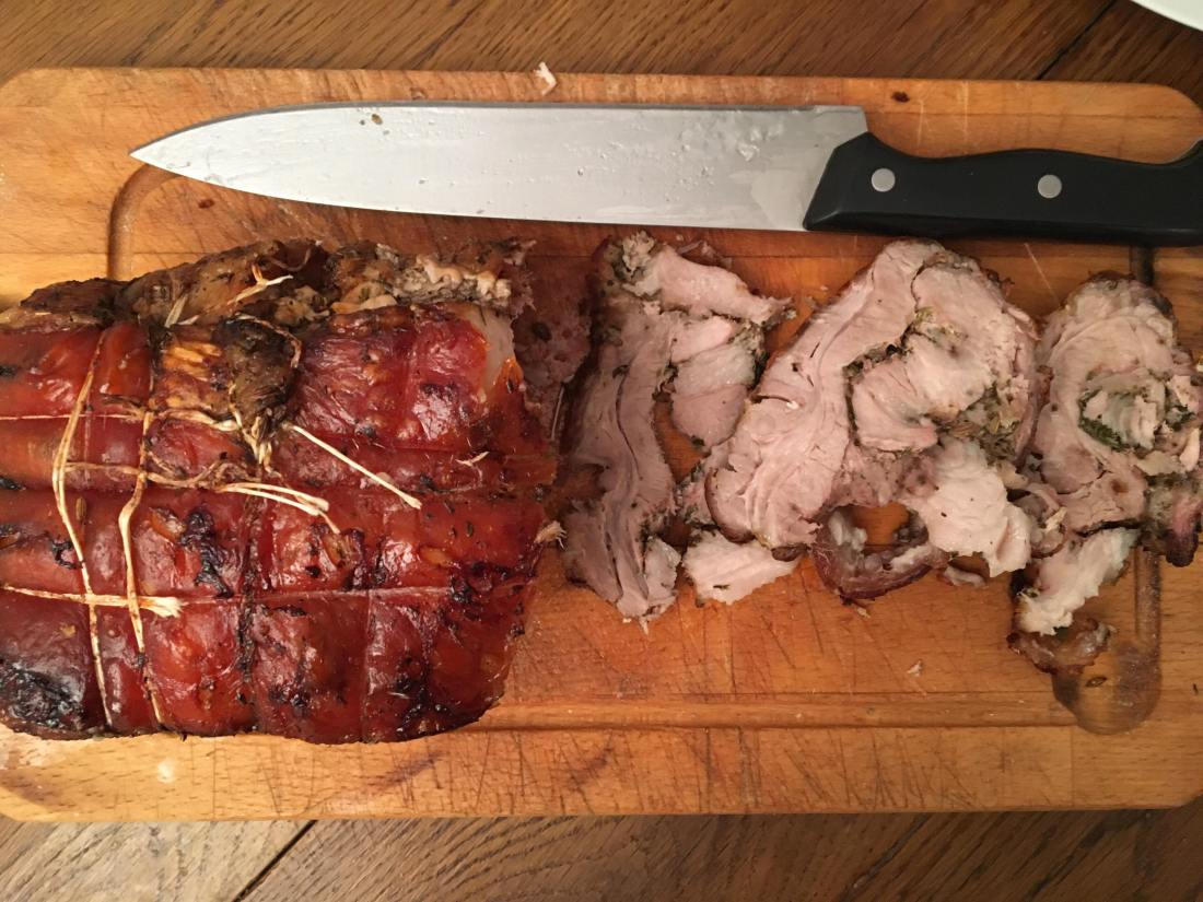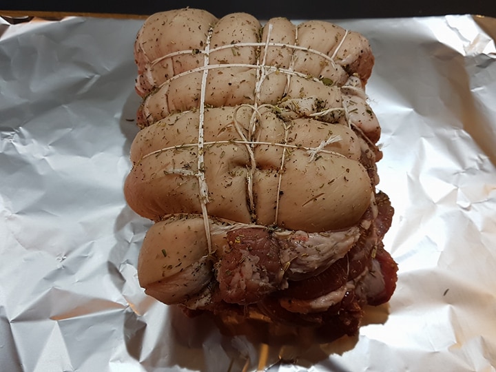 Le rôti : il ira se loger dans la poitrine enroulée et ficelée. Comme le morceau était très volumineux, j’ai préféré le couper en tranche dans le sens de la longueur et je l’ai aromatisé comme la poitrine.