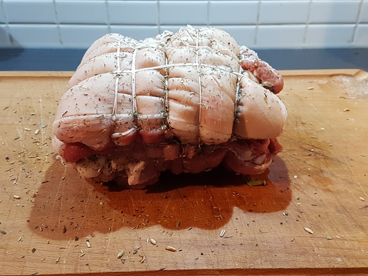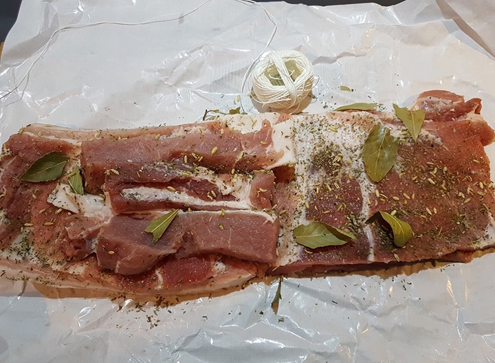800 g. de poitrine de porc désossée, 500 g. de rôti de porc, sauge, laurier, thym, graines de fenouil, romarin, persil, sel, poivre, une gousse d’ail, de la noix de muscade, un verre de vin blanc sec, un verre d’eau, de la ficelle, un peu d’huile extra vierge d’olive