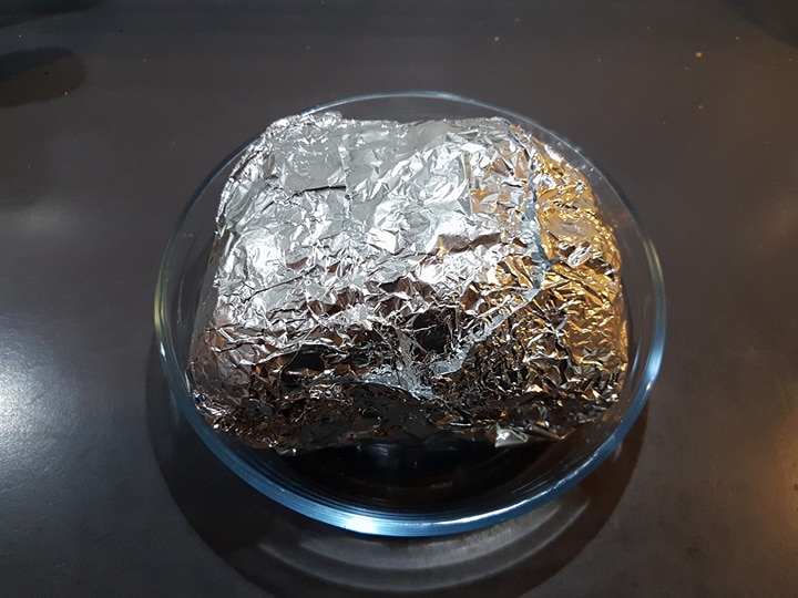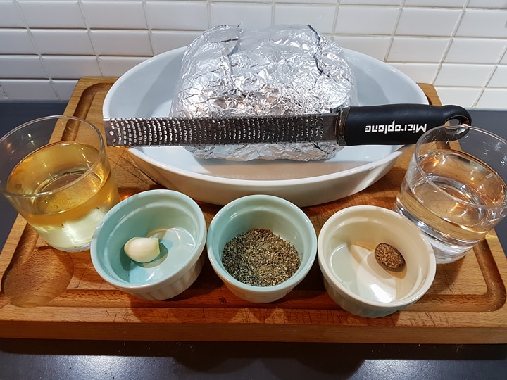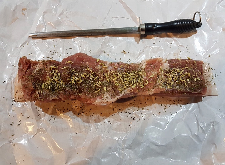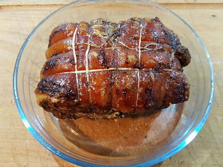 C’est le moment d’emballer la porchetta dans une feuille de papier aluminium et de la faire reposer au réfrigérateur, pendant toute une nuit et une partie de la journée (au moins 16 heures au total).