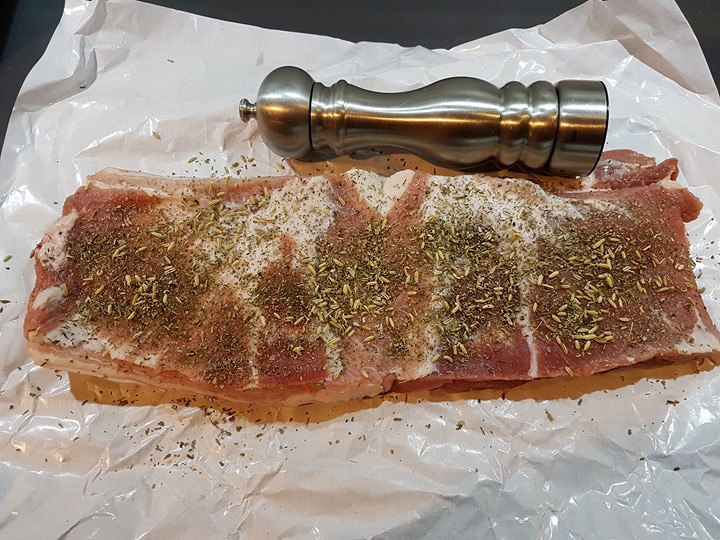 La couenne devra être entaillée au couteau pour que le gras fonde, puis parsemée d’aromates.