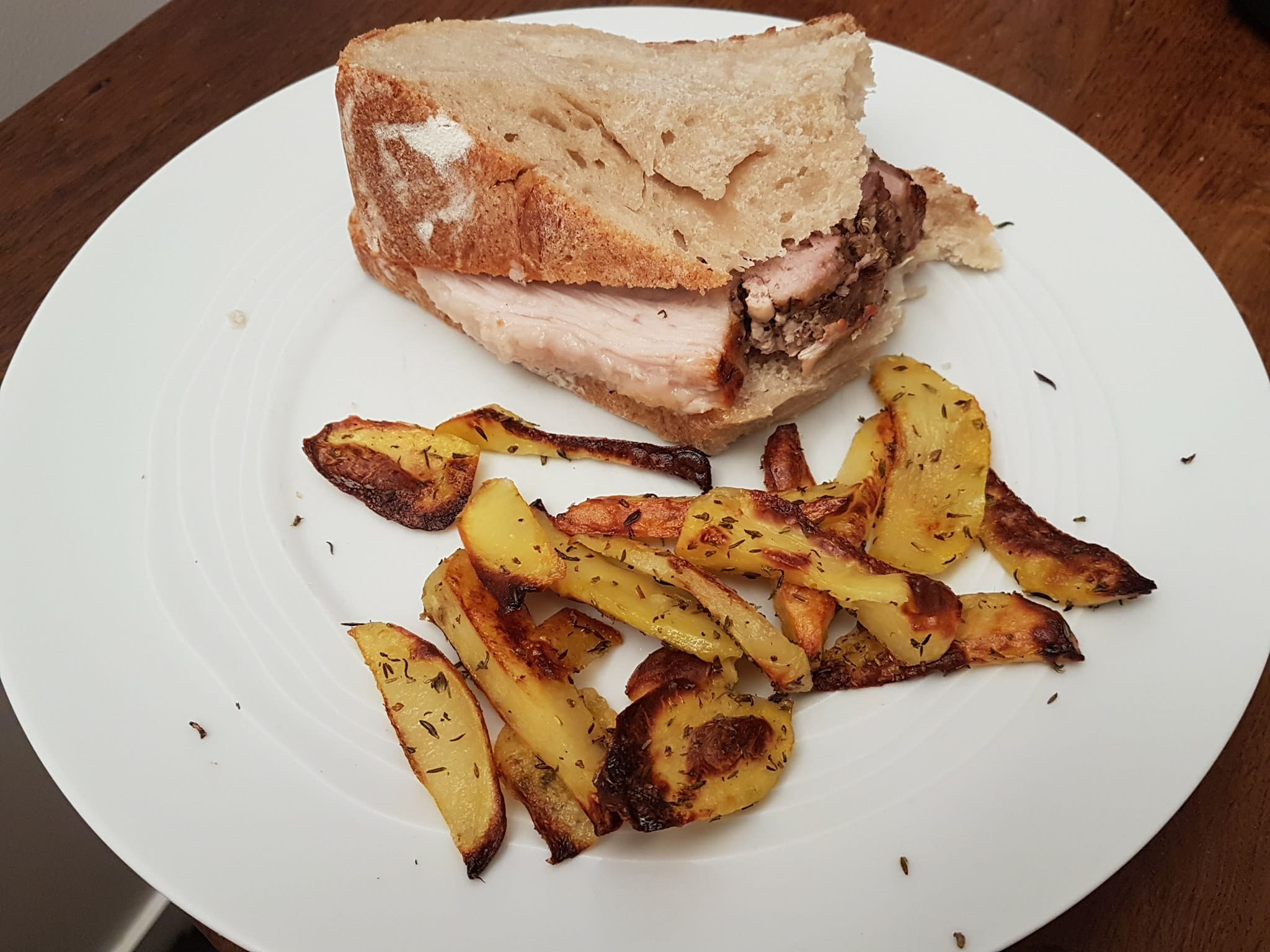 En revanche, le cochon utilisé pour la porchetta est presque systématiquement issu de la race Large White, dérivée du Landrace anglo-danois et importée en 1873 dans la Plaine du Pô. La raison est évidente : il est plus gros, plus fertile, plus productif (le jambon de Parme est aussi issu de cette race). Pour faire une bonne porchetta (qui ne soit pas un cochon entier), on utilise plusieurs morceaux de choix. A Paris, j’ai acheté de la poitrine fraîche et désossée (de porc breton sans doute) et un rôti d’échine, une arista en italien.