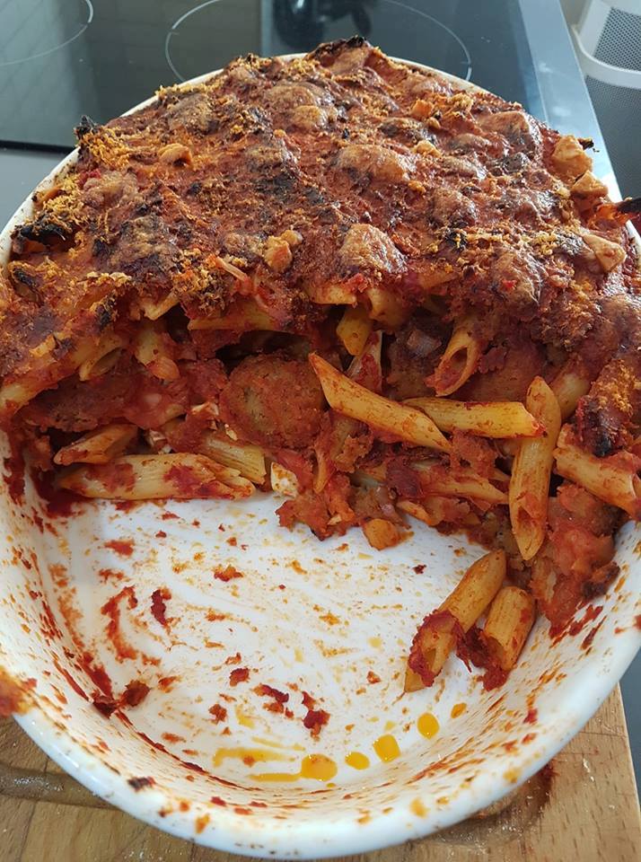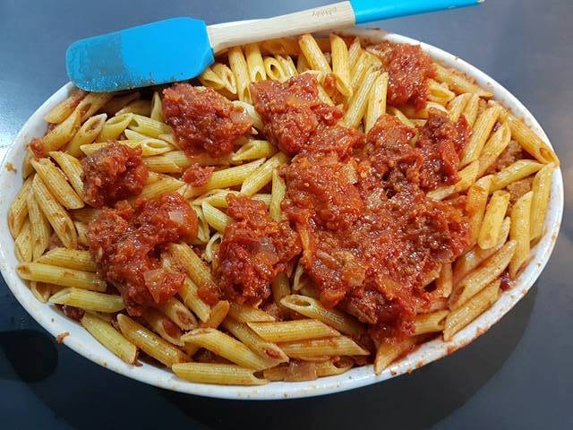 En revanche, moi j’avais en tête une variante plus tardive et light pour « seulement » cinq personnes, élaborée avec des penne et de la viande hachée, sans paupiettes ni charcuterie ni béchamel (question de temps et de mains à disposition, sans doute). Sans compter que dans le Sud la chaleur, qui arrive tôt dans l’année, n’invite pas trop à rester devant les fourneaux…