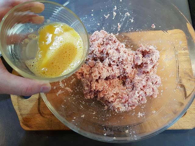 Deuxième étape : on ajoute à la farce les deux viandes hachées et un oeuf battu. Le tout mélangé à la main.