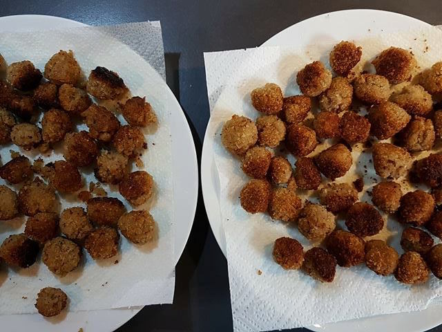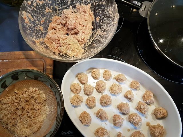 Et finalement, la création : pour chaque paupiette, de la taille d’une cerise, un peu de farce doit être roulée entre les deux mains, pour ensuite être passée dans un peu de mie de pain émiettée et un peu de chapelure. La panure sera plus croquante.