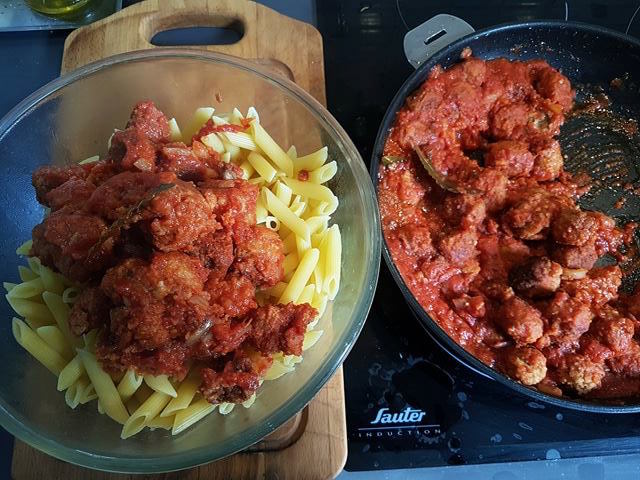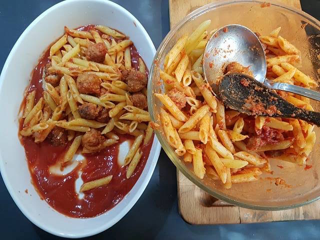 Et maintenant, les pâtes. Il faut d’abord les faire cuire à l’eau la moitié du temps indiquée par le fabriquant. Autrement, elles seraient trop molles, à la fin de la cuisson dans le four. Une fois égouttées, elles seront mélangées avec la moitié de la sauce tomates et de paupiettes.