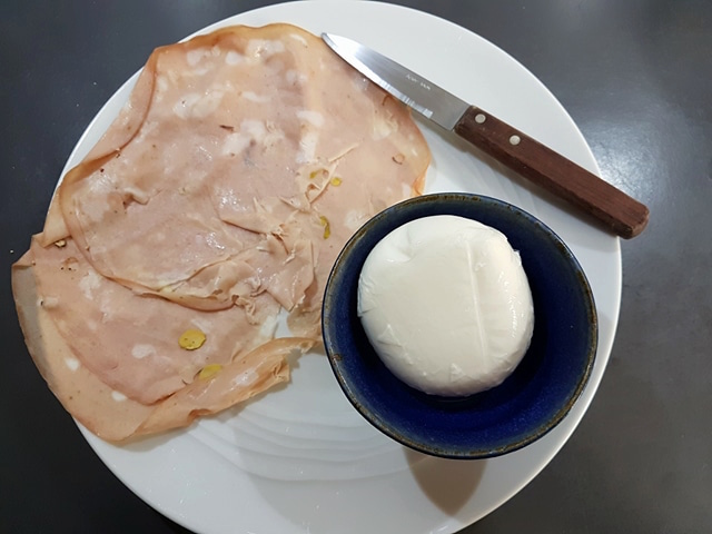 Venons-en au reste de la farce : j’ai utilisé de la mortadella, plus légère que le jambon cuit et une mozzarella.