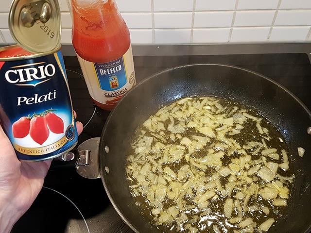 Pour la sauce. 1 boîte de tomates concassées (400 g. égouttées), de la pulpe de tomate (400 g.), 1 oignon (ou échalote), 1 verre de lait (éventuel), deux feuilles de laurier.