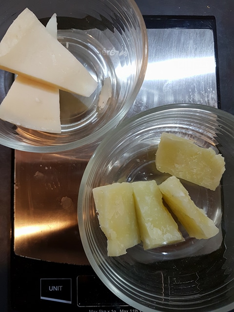 Entre temps, on pourra râper deux types de fromage : le parmigiano reggiano et le pecorino romano (l’un doux, l’autre salé).