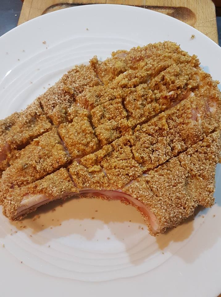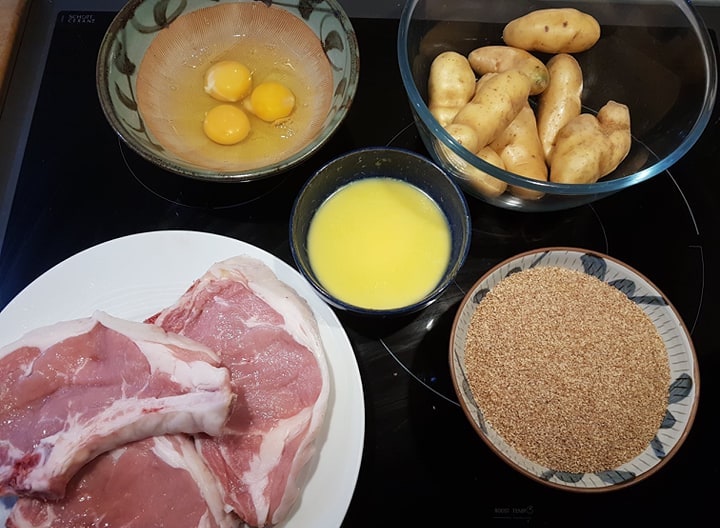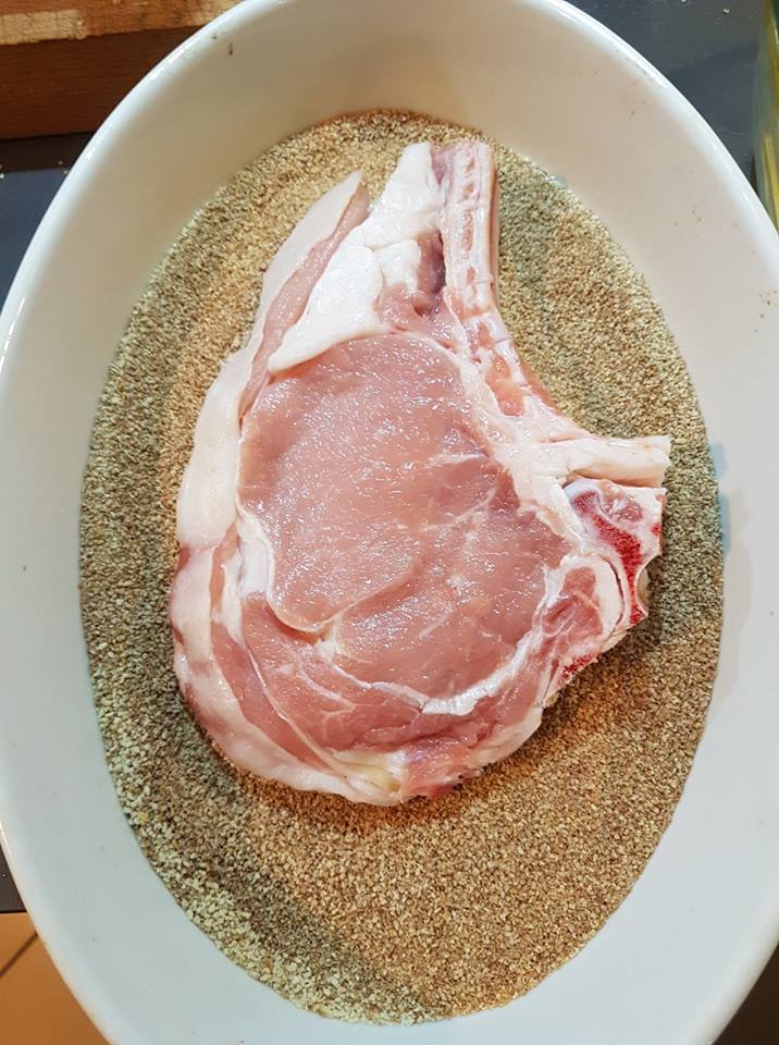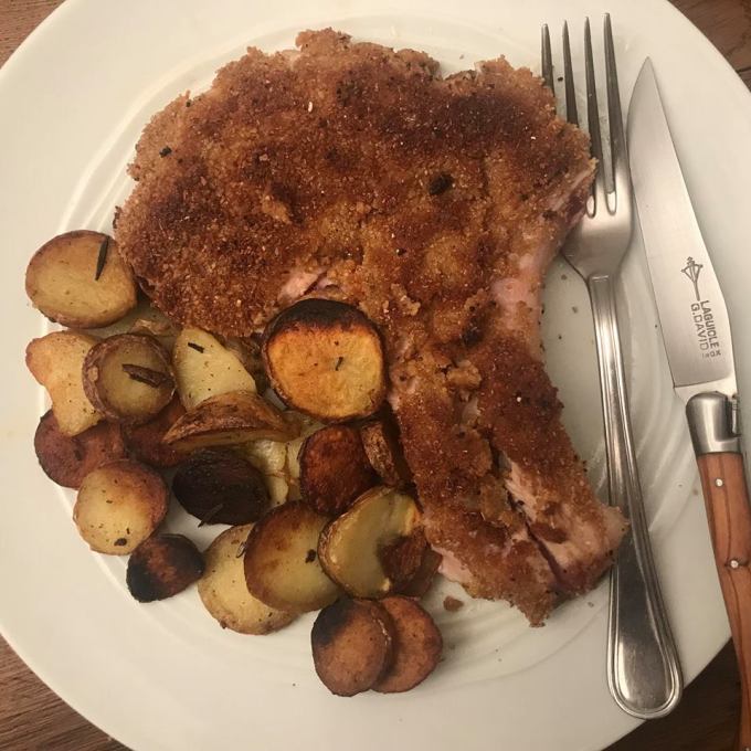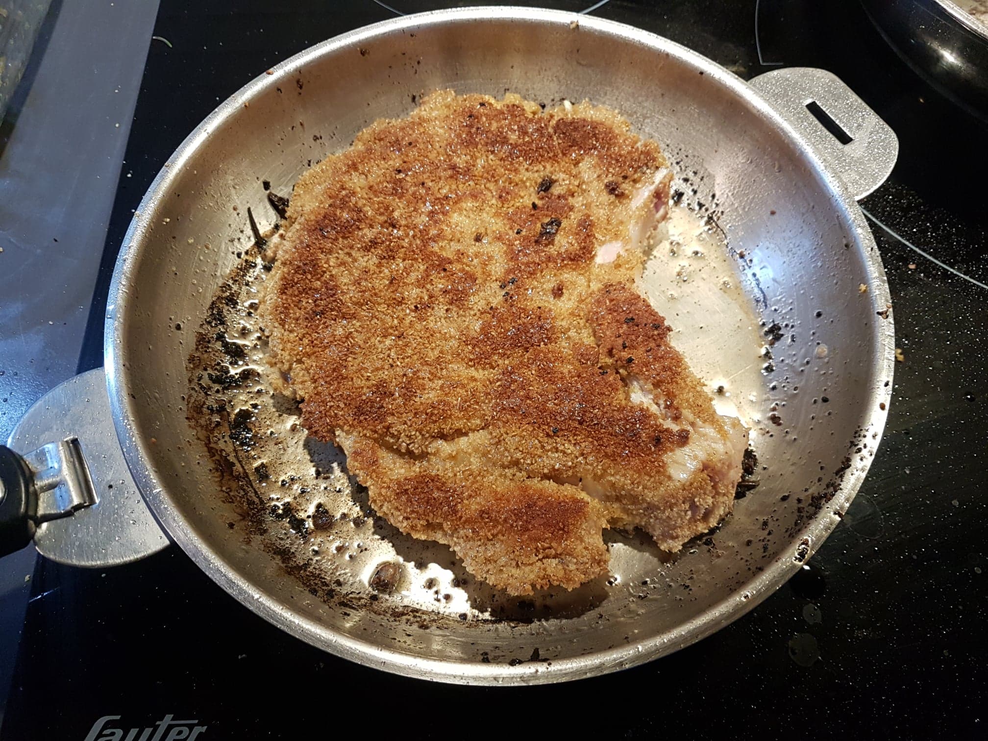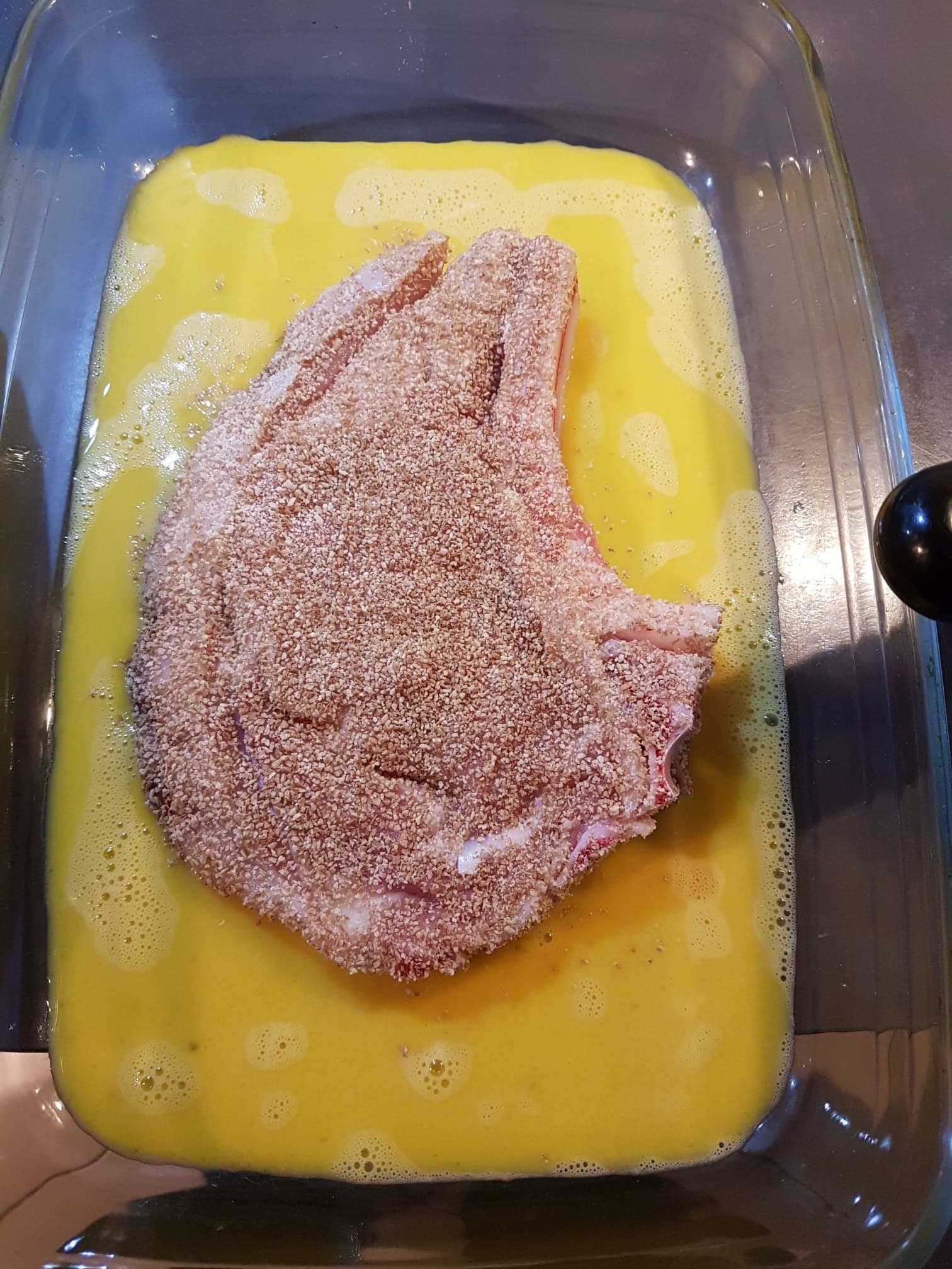 A savoir : des costolette avec l’os bien épaisses, des oeufs, de la chapelure (autrefois on utilisait la mie de pain râpée), et des pommes de terre. Nota bene : cela n’existe nulle part, en Italie, la viande avec des pâtes en garniture !