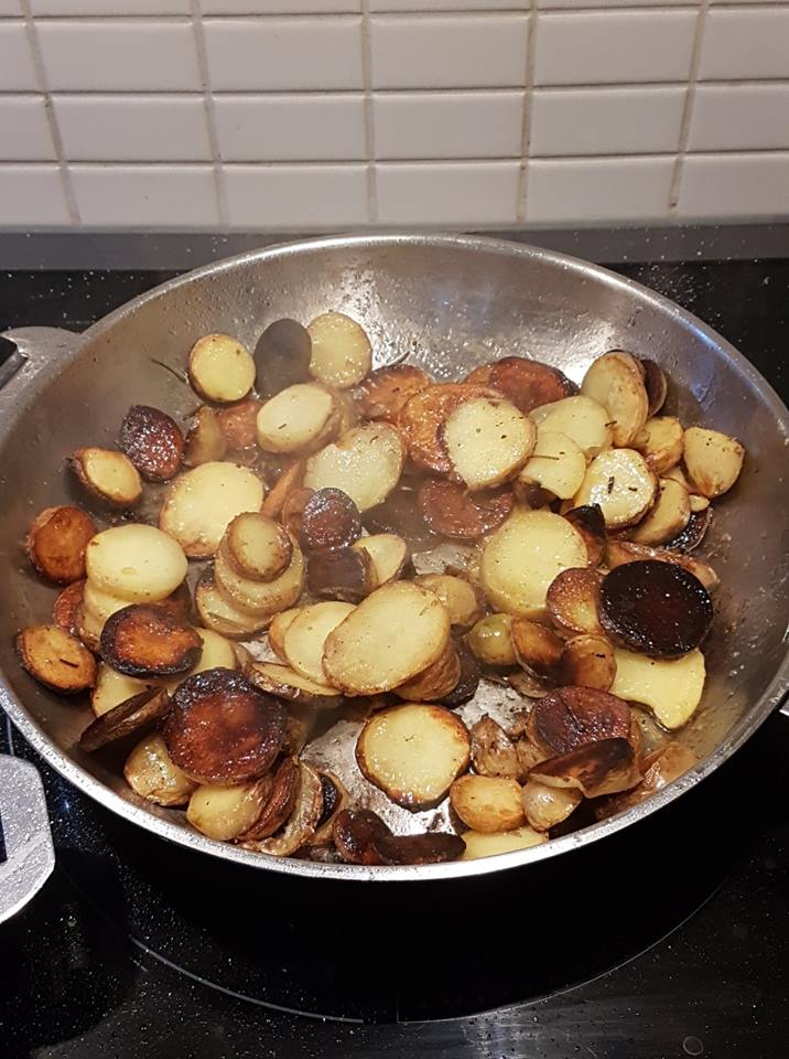 Quant aux pommes de terre, elles devront cuire (au même temps que la viande) dans du beurre clarifié, avec une gousse d’ail en chemise, du sel et quelques branches de romarin. A la fin quelques grains de poivre noir ne seront pas de trop.