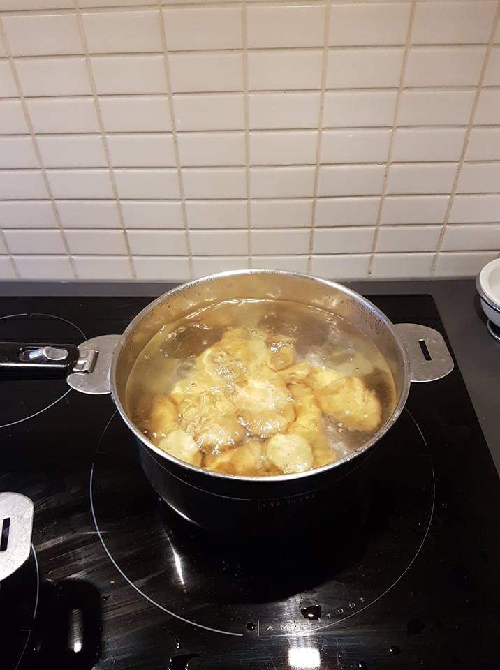 …En revanche en Italie on utilise plusieurs types de pommes de terre, parmi lesquelles la ratta, clairement dérivée de la ratte française. Et c’est justement celles là que j’ai employée (voilà, satisfaits ?). Mais pas n’importe comment. D’abord, il faut les laver avec de l’eau et du bicarbonate de sodium. Ensuite, il faut les laisser quelques minutes dans un bol avec de l’eau froide. Ainsi elles perdront un peu d’amidon et elle ne s’oxyderont pas.