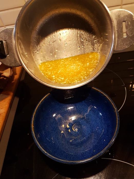 J’ai attendu qu’il se stabilise, et puis j’ai enlevé les dernières traces d’écume à la surface…et voilà. Le ghee est prêt. Une fois refroidi, je l’ai laissé reposer au réfrigérateur pendant un quart d’heure. Le temps de préparer les autres ingrédients.