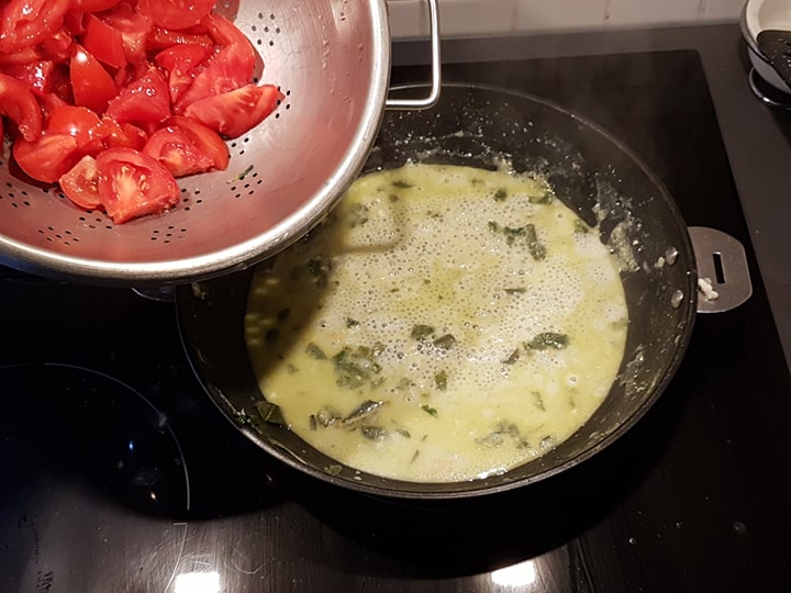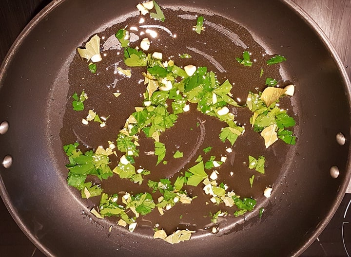 Puis vient le temps de la cuisson. Dans une poêle au fond anti adhérent, on fait chauffer d’abord de l’huile extra vierge d’olive, puis les aromates…
