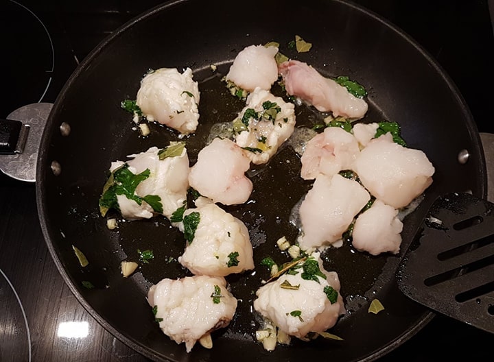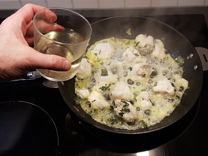 …avant d’ajouter un verre de vin blanc sec. Une fois évaporé on poursuit la cuisson un court instant. Attention à ne pas trop laisser mijoter la lotte, faute de quoi vous risquez de vous retrouver avec de la chair caoutchouteuse.