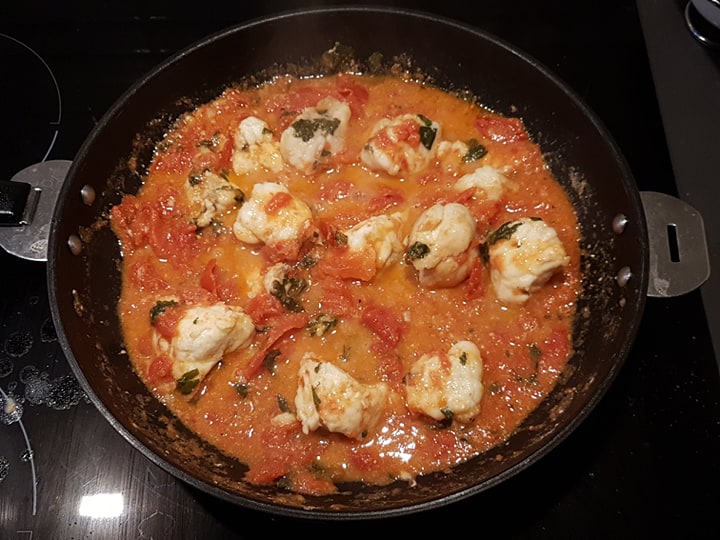 Quand les tomates seront complètement fondues et la sauce bien réduite, ajoutez à nouveau les morceaux de poisson, pour les imprégner de sauce.