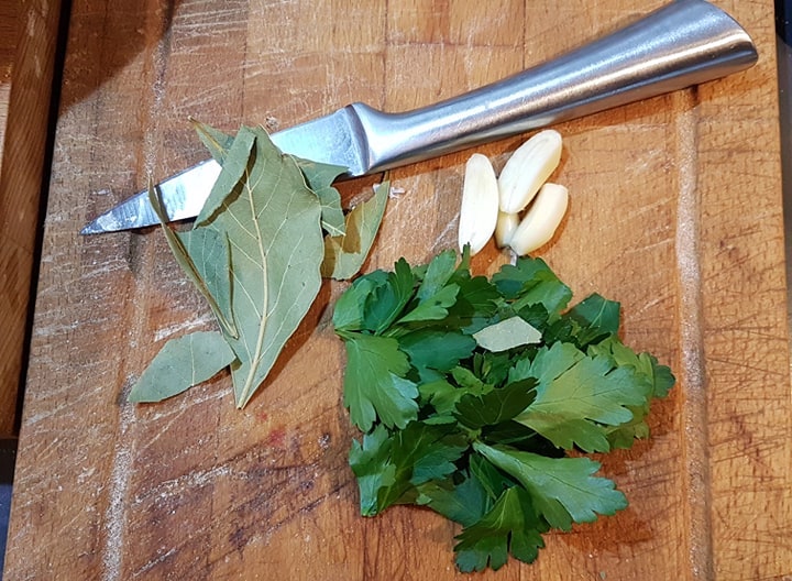 Ensuite, on prépare la garniture : quelques gousses d’ail, un piment rouge, du persil, du romarin, et si vous le souhaitez d’autres aromates.