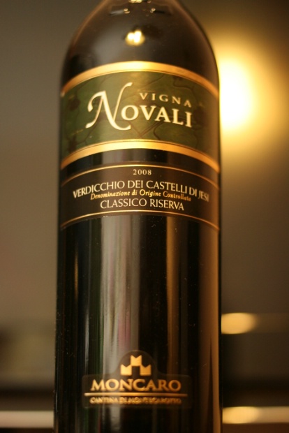 En revanche, pour le vin, j’ai hésité parce que dans les Marches il y a deux écoles de pensée. Il y a ceux qui préfèrent un rouge puissant (comme celui de Monte Conero, à pic sur la mer à deux pas d’Ancone), à cause du piment et des tomates. D’autres optent pour un blanc plus délicat, en raison de la saveur délicate de la lotte. Moi j’ai finalement choisi un blanc A.O.C. : un Verdicchio dei Castelli di Jesi, produit dans les provinces de Macerata et Ancona, sur les collines à une trentaine de km de la mer.