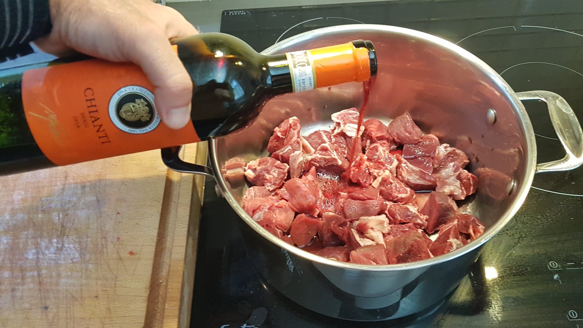 Mais avant de la cuire, il faut faire mariner le boeuf. La viande doit être recouverte d’un litre de Chianti. Ne vous inquiétez pas, il y en a pour toutes les poches.