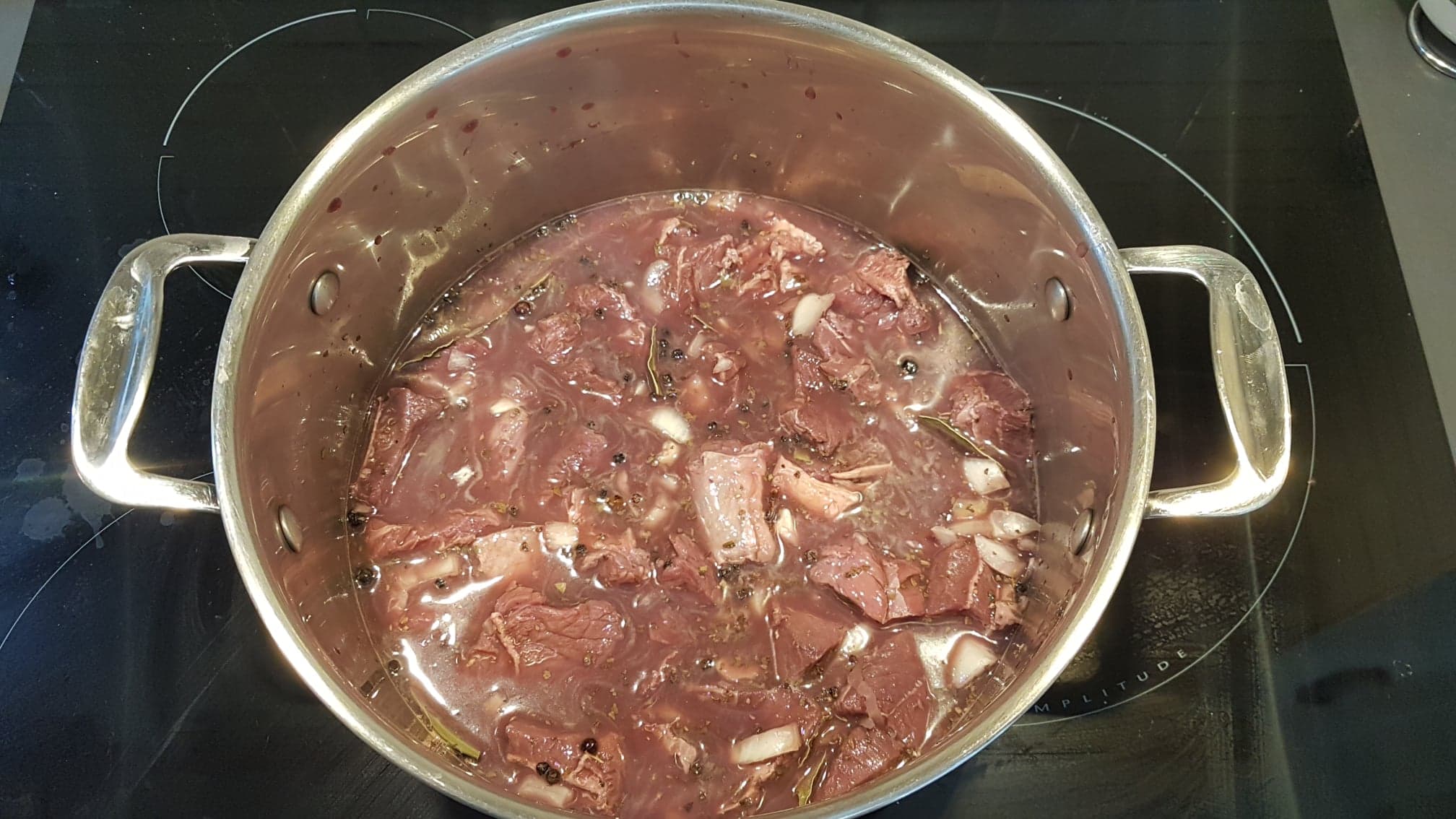 La marinade doit comprendre aussi un oignon émincé, et deux ou trois gousses d’ail écrasées.