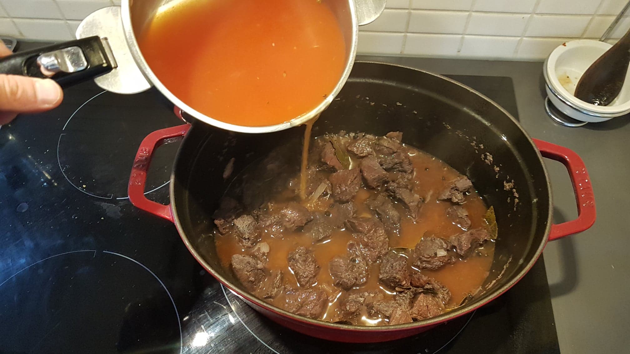 1. Alors bravo pour la recette moi je le fais avec du jarret de bœuf en tranches épaisses j’enlève les os à moelle que je sale je coupe en morceaux le jarret après je fais cuire avec du vin longtemps au four 150 degré pas de bouillon et les os posés dessus et voilà …