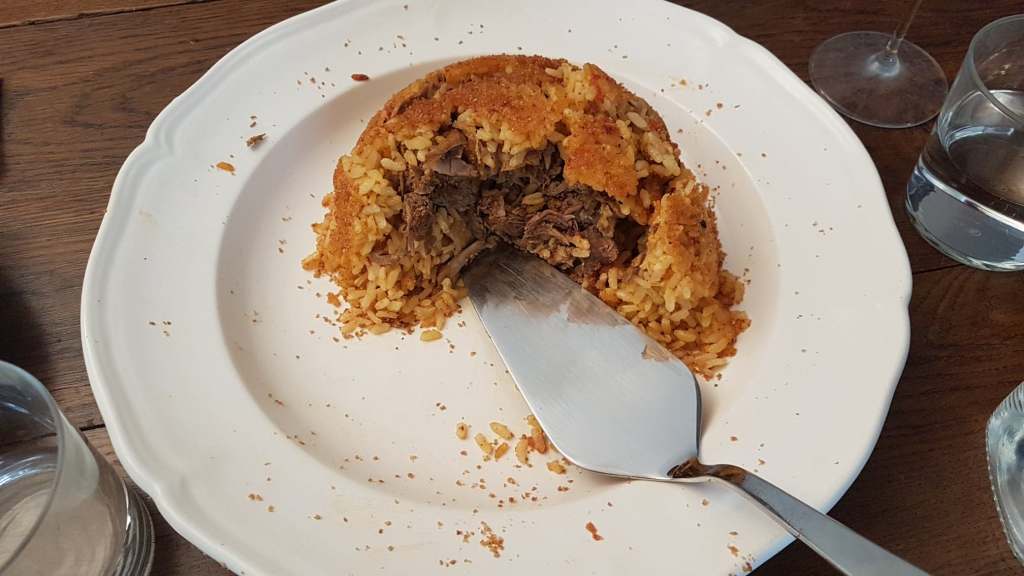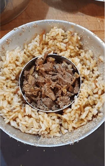 Le riz, justement. Il ira remplir le projectile, sauf une portion centrale que accueillera le ragoût de pigeon. Pour tenir séparés les deux ingrédients, j’ai utilisé un rond de serviette de table en metal, que j’ai enlevé une fois l’opération terminée.
