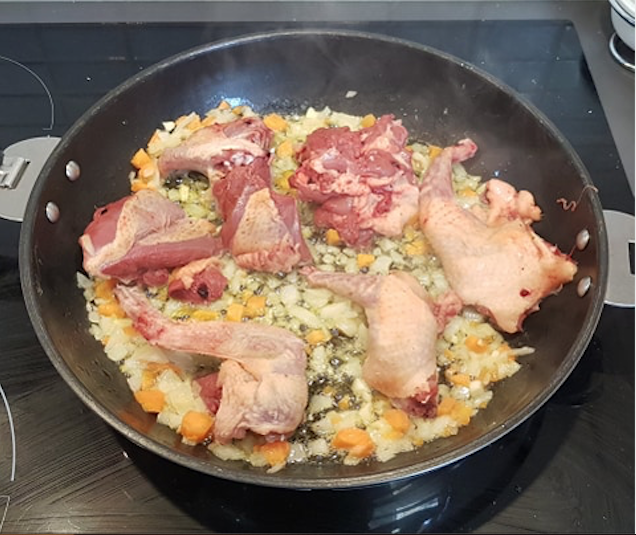 Et c’est parti. Première étape : un mirepoix des légumes, à rissoler dans une large poêle avec un fil d’huile extra vierge d’olive et un morceau de beurre. Au bon moment, il faudra ajouter le pigeon, vidé (mais on gardera les abats) et dépecé (j’ai préféré le cuire avant de le désosser, pour me faciliter la tâche).
