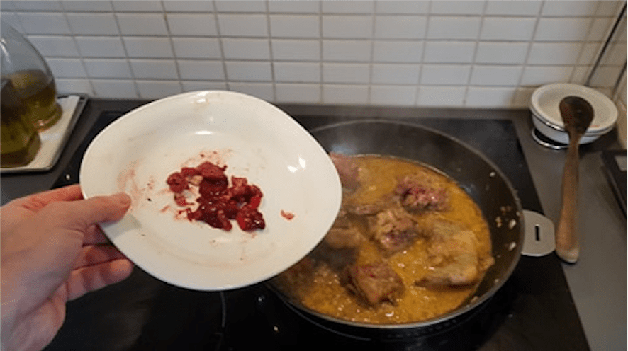 Troisième étape : L’ajoute de tomates en conserve ou en coulis (celles de Reggio sont d’excellente qualité pour le standard italien). Surtout n’utilisez pas de concentré, souvent d’infime qualité chinoise. A present, il faut laisser réduire la sauce avec le couvercle sur la poêle, éventuellement avec quelques louches des bouillon végétal.