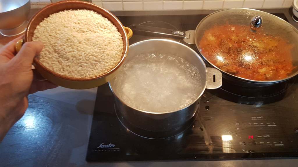 Entretemps : le riz. Avant de le mettre dans la « bombe », il doit être en partie cuit (10 minutes sur les 17-18 réglementaires ).