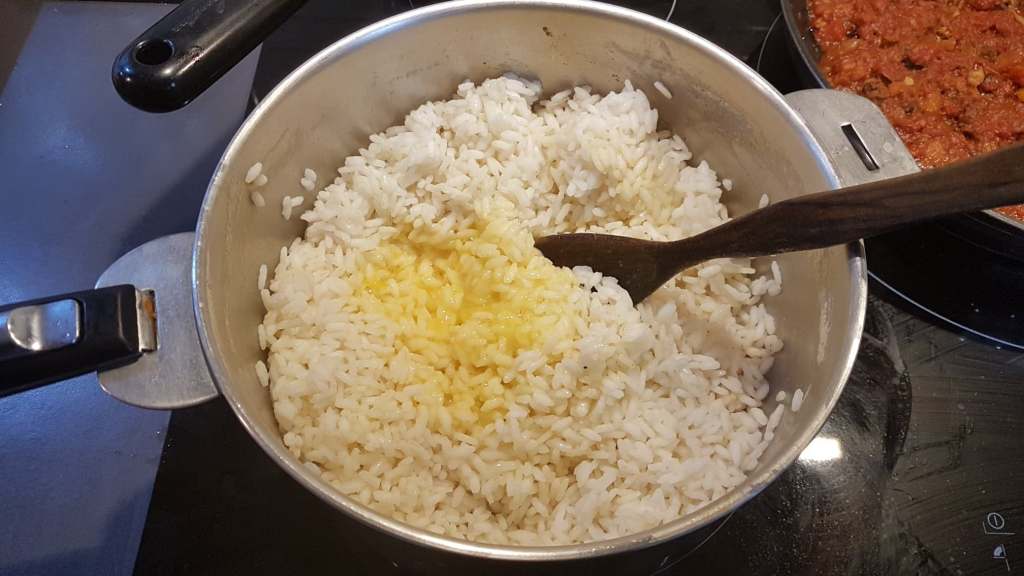 En suite, le beurre fondu sera mélangé au riz (égoutté), avec des oeufs battus…