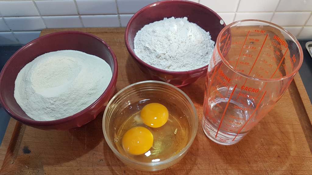 pour les pâtes; 200 gr. de farine blanche, 200 gr. de semoule de blé dur, 3 oeufs, eau;