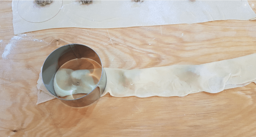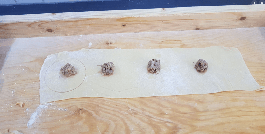 Une fois la pâte et la farce prête, il faut les assembler et ce n’est pas une mince affaire. J’ai étalé la pâte finement avec un rouleau à pâtisserie sur une planche de travail ; mais vous pouvez aussi utiliser une machine à pâtes manuelle. Ensuite j’ai déposé à intervalles réguliers une peu de farce, puis j’ai créé un cercle à l’aide d’une roulette coupe-pâte et retourné la pâte sur elle-même pour obtenir le casoncello.