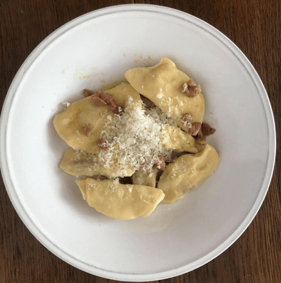 Avant de les faire cuire, il faut s’atteler à la dernière étape : la sauce, à base de poitrine fumée, beurre et sauge (si vous arrivez à la trouver fraiche, ce sera encore mieux). Faites revenir le tout quelques minutes et en attendant faites bouillir de l’eau et jetez-y les casoncelli pendant trois minutes, passez-les dans la poêle avec la sauce et servez-les avec du Grana Padano râpé.