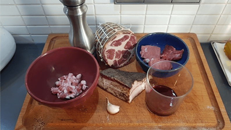 Ensuite, la farce. A Bergame, on utilise tout d’abord un ingrédient appelé « pasta di salame« , composé de poitrine fumée, de bas joue, de coppa et d’épaule (le tout de porc), plus de l’ail, du poivre et du vin rouge. A Paris ce produit est introuvable même en temps normal, alors j’en ai fait moi-même, avec les moyens du bord.