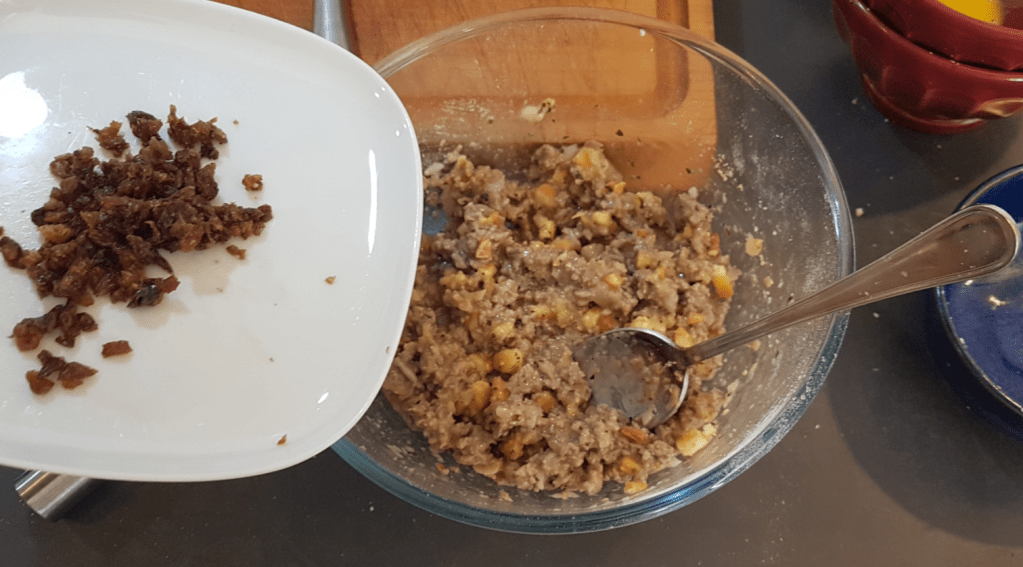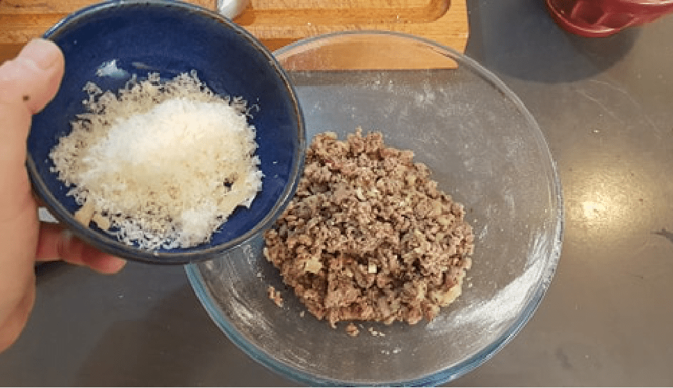 Une fois cet ensemble doré, je l’ai transféré dans un bol, et mélangé avec du fromage Grana Padano râpé…