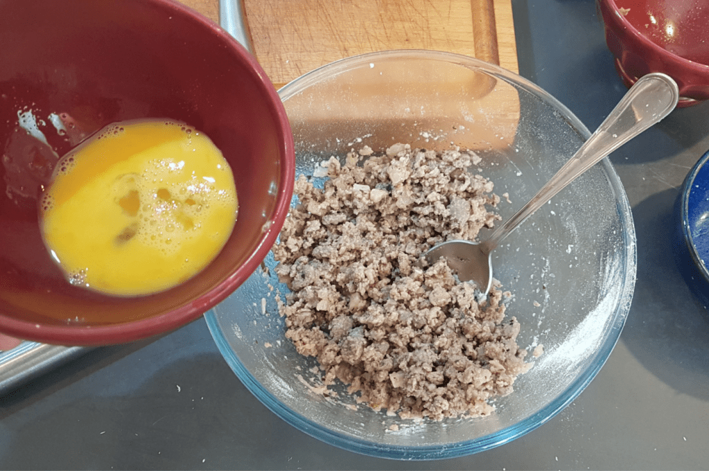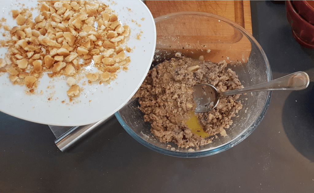 …et de la chapelure de pain, plus du sel et du poivre. Au final, la farce devra être souple et pas humide.