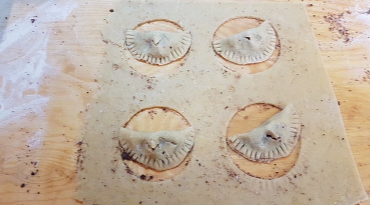Puis il faut retourner l’une des moitiés des cercles, pour former des petits chaussons en demi lune. A l’aide d’une fourchette, pressez le contour de chaque chausson pour bien le seller, et avec des ciseaux pratiquez une petite incision sur le sommet. Il servira à ne pais fair éclater la pâte pendant la cuisson.